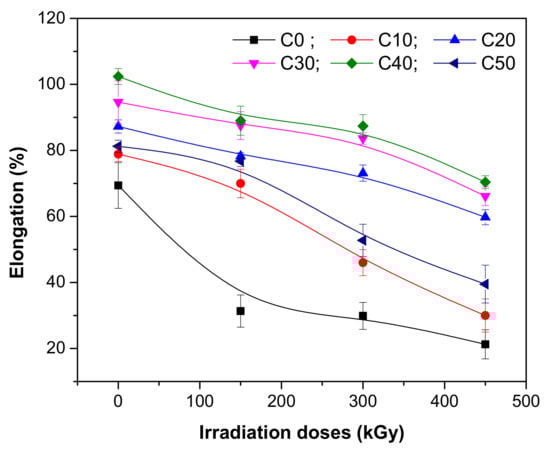 Elongation at break is related with the resistance of material to shape changes until the fissures are formed. As can be seen in Figure 3, before irradiation, the addition of PS leads to an improvement of the elongation at break from 69.38% to 78.88% for 10 ppm addition, respectively 81.25% for the case of 50 ppm addition. After irradiation, the elongation at break decreases, regardless of the radiation dose and type of mixture, a result that is associated with the increasing of cross-linking degree and appearance of degradation. The composite became less ductile due to the restriction of the polymer chains’ free movement [33,34]. Samples without PS presented the highest variations of elongation at break as the irradiation dose increased, from 54.84% at 150 kGy up to 68.73% at 450 kGy. The addition of PS makes the material more stable in the radiation field. The statement is supported by results that are as follows: for 10 ppm addition (C10), from 11.25% (at 150 kGy) up to 61.96% (at 450 kGy); for 20 ppm addition (C20), from 10.23% (at 150 kGy) up to 31.52% (at 450 kGy); for 30 ppm addition (C30), from 7.53% (at 150 kGy) up to 30.11% (at 450 kGy); for 40 ppm addition (C40), from 13.06% (at 150 kGy) up to 31.25% (at 450 kGy); for 50 ppm addition (C50), from 5.53% (at 150 kGy) up to 51.38% (at 450 kGy). This is an interesting result taking into account the opposite tendencies of elongation and tensile strength. From the presented results, it can be observed that the mixtures that contain high loadings of PS still present an elastic behavior at the irradiation dose of 150 kGy. The composite is not brittle and the existence of a good compatibility between the PS and polymeric matrix can be assumed, even in the case of 50 ppm addition. A good dispersion of PS particles in the polymeric matrix compensates for the incompatibility between the hydrophobic nature of natural rubber and hydrophilic nature of starch. A large surface of PS particles is exposed to natural rubber molecules, leading to a huge interfacial volume around the filler (PS) and also to the hardness increasing, as can be seen from Figure 1. The mechanic resistance is increased by synergistic effect, the elongation at break is improved, and the fracture of the material takes place only after a long elongation [35]. Over the irradiation dose of 150 kGy, this trend is no longer maintained, the effect being proved by the elongation reduction. So, the increasing of PS loading and the applying of irradiation treatment leads to the decreasing of elongation, an effect associated with the appearance of degradation.