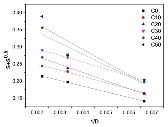 For the quantitative evaluation of cross-linking and chain scission yields of irradiated NR and NR/PS mixtures, were done plots of S + S1/2 vs. 1/absorbed dose (D) from the Charlesby–Pinner equation [24,25]