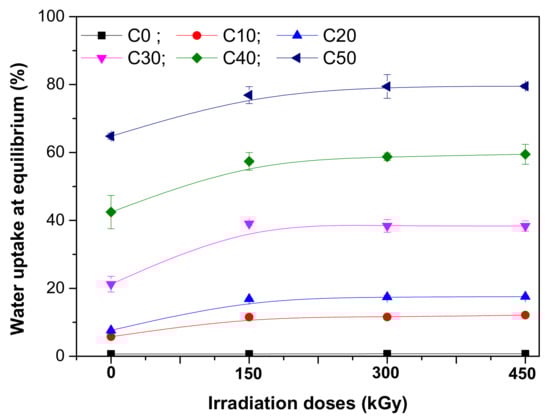 Water uptake tests were done in order to demonstrate the occurrence and the influence of high hydrophilic polar groups during irradiation. The results are presented in Figure 7.
