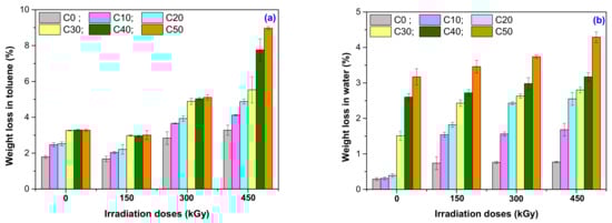 As seen in Figure 8a, even the non-irradiated sample C0 exhibits a weight loss of 1.79%, possibly due to the existence of some fractions of non-vulcanized NR. By applying the irradiation treatment, the weight loss increased up to 3.28%, due to the scissions in cross-linked elastomer, i.e., degradation. In the case of irradiated C0–C50 mixtures, the weight loss after the immersion in toluene increased both with the irradiation dose and PS amount. The non-irradiated NR/PS composites presented increased weight loss as the PS amount increased. Thus, the weight loss for C10 was 2.4% reaching up to 3.28% for C50. The weight loss for the irradiated sample C10 started from 2.4% at 150 kGy to 4.12% at 450 kGy, and for the irradiated sample C50 from 3.01% at 150 kGy to 8.97% at 450 kGy. The soluble fraction increased, a fact that also leads to the idea of installing the degradation process in the NR/PS composites. Because starch is a polysaccharide insoluble in water and organic solvents, the weight loss in toluene can be attributed to the degradation of NR by EB irradiation.