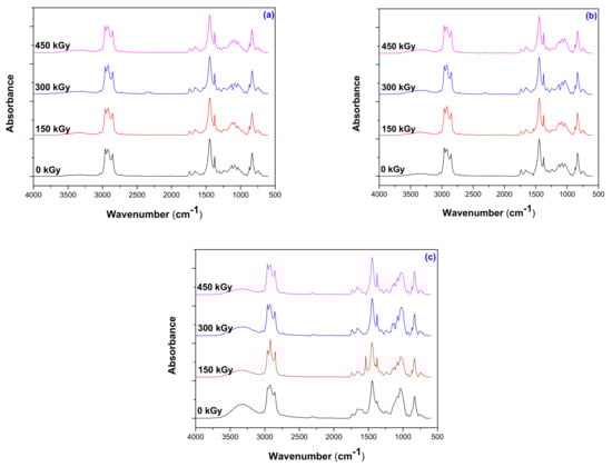 As seen in Figure 9, some bands appeared to be modified by the reactions that took place during EB irradiation. The products that must be identified as being associated with the degradation are hydroperoxides, alcohols, aldehydes, epoxides, ketones, esters, and carboxylic acids [59,60]. There are some types of reactions that occur simultaneously in any material subjected to EB irradiation: cross-linking, chain branching, chain breaking with the formation of characteristic groups as methyl or tertbutyl due to the homolytic and heterolytic dissociations and oxidation with the formation of peroxides, alcohol groups, and carboxylic groups [61].