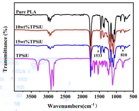 For pure PLA, the CH3 asymmetric stretching and asymmetric deformation modes appeared at about 2997 and 1455 cm−1, respectively. The band at about 1755 cm−1 was the vibration of C=O. The bands at 1182, 1131, and 1086 cm−1 were related to the C–O–C stretching vibration modes. With the addition of TPSiU, PLA/TPSiU blends had almost the same FTIR spectra with pure PLA. It is worth noting that the bending vibration peak of N–H in -NHCOO- appeared near 1533 cm−1 and the stretching vibration peak of Si-CH3 appeared at 810 cm−1, which provided the evidence that TPSiU was effectively blended into PLA, but no chemical reactions occurred.