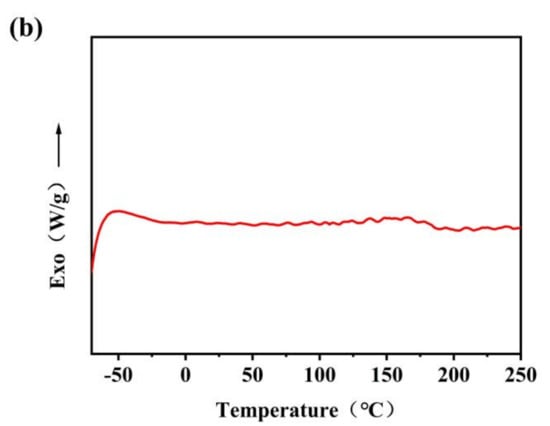 Figure 3a,b showed the cooling curve and secondary heating curve of TPSiU, respectively. It can be seen from that the glass transition temperature of TPSiU was not obvious, and there was no obvious crystallization exothermic peak and melting endothermic peak in the whole range, indicating that TPSiU was an amorphous polymer.