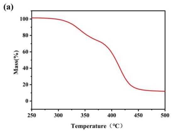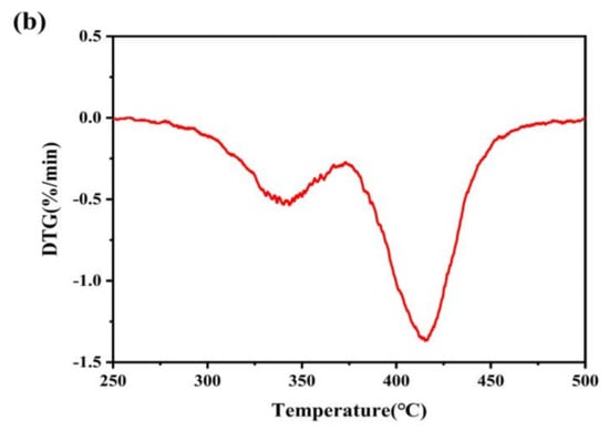 Figure 5a,b showed the TGA curve and DTG curve of TPSiU. The thermodynamics of TPSiU were mainly divided into two weight loss sections: 275–380 °C and 380–470 °C. The weight loss rate of the first stage was about 29%. This was due to the decomposition of the hard urethane in the TPSiU molecular structure. The thermal degradation temperature of the urethane was lower than that of the urea group, so the carbamate was degraded first. The weight loss rate of the second stage was about 59%, which corresponds to the decomposition of the polyester and silicone skeleton in the TPSiU soft stage. In the whole thermal degradation process, the hard segment had the fastest degradation rate at 340 °C, and the soft segment had the fastest degradation rate at 415 °C. The temperature of 5 wt% weight loss corresponds to 320 °C, indicating that the product had good thermal stability.