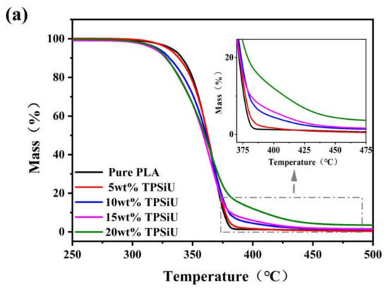 TGA curves and derivative thermogravimetric (DTG) curves of PLA/TPSiU blends under nitrogen atmosphere were shown in Figure 6a,b, respectively. The initial decomposition temperature(T5%), defined as the temperature at 5 wt% weight loss, and the final decomposition temperature (Tend) of PLA/TPSiU blends were summarized in Table 2. T5% of PLA/TPSiU blends decreased slightly with the increase of TPSiU content. When the TPSiU content reached above 15 wt%, T5% of PLA/TPSiU blends decreased about 10 °C compared with pure PLA. This may be due to the T5% of TPSiU being lower than that of pure PLA. The fastest weight loss rate temperature (Tmax) of all samples were almost similar. The enlarged curves in the 400–480 °C region were shown in the inset of Figure 6a. In the inset, one can clearly identify that Tend of PLA/TPSiU blends was improved significantly. It is also exhibited that the residual mass at 500 °C increased when TPSiU content increased, which resulted from the non-decomposable silicon contained in TPSiU. From the above results, the thermal stability of PLA/TPSiU blends decreased slightly with the increase of TPSiU content, but the T5% of the blend system was in the range of 320–330 °C, and the Tmax was in the range of 365–367 °C.
