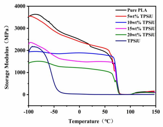 Dynamic mechanical properties in the solid state were investigated employing the flat sheets obtained by the injection molding. The dependence of storage modulus E′ for PLA/TPSiU blends with different TPSiU content was shown in Figure 7. The storage modulus E′ of PLA decreased sharply at around 62–80 °C, indicating that the molecular segments obtained enough thermal energy to continuously change the conformation and realized the transition from the glass state to the rubber state. As for PLA/TPSiU blends, the peak temperature due to the glass transition of PLA was independent of the blend ratio, suggesting that mutual dissolution did not occur. The storage modulus E′ below the glass transition temperature of the blends decreased compared with the pure PLA. Also, the increase of TPSiU content caused a distinct decrease in the storage modulus E′ because the storage modulus of TPSiU was much lower than that of pure PLA as shown in Figure 7.