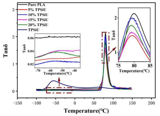 Temperature dependence of tan δ for PLA/TPSiU blends.
