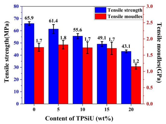 Figure 10 shows the tensile strength and tensile modulus of PLA/TPSiU blends. The tensile strength of TPSiU was 13 MPa (data provided by TPSiU manufacturer). It was found that the tensile strength of PLA/TPSiU blends decreased gradually with the increase of TPSiU content, which was consistent with previous research results on rubber-toughened polylactic acid [44,45]. On the one hand, this may be due to the existence of TPSiU, which weakened the interaction between the molecular chains of PLA, leading to premature breakage during the stretching process. On the other hand, due to the elastomeric nature of TPSiU, its inherent tensile strength was lower than that of PLA, resulting in a decrease in the tensile strength of the blends. When the amount of TPSiU added was 15 wt%, the tensile strength was 74.5% of pure PLA, and the decrease rate increased with the increase of the TPSiU content. When the content of TPSiU was 20 wt%, the tensile strength was about 43.1 MPa, only 65.4% of pure PLA. In comparison with other studies, the remarkably improved impact toughness is commonly accompanied by weakened tensile strength, that is, up to 50% of decrease compared to pristine PLA [30]. Therefore, when blending and toughening modified polylactic acid is used, it is necessary to fully consider the comprehensive mechanical properties while improving its toughness.