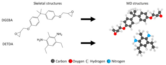 For the nanoscale computational work, MD simulations were performed using the open-source LAMMPS software package (Sandia National Laboratories, Albuquerque, NM) [56,57]. The MD modeling procedure adopted in this study is based on a procedure published previously [55]. The MD models were initially built using a fixed-bond force field (OPLS) [58,59] to perform crosslinking reactions of epoxy monomers. A transition simulation into an efficient reactive force field (ReaxFF) with the parameterization of Liu et al. [60] was subsequently performed to all MD models, followed by equilibration to prepared for mechanical property prediction at the nanoscale level. Three-dimensional periodicity was considered for all MD models to mimic the bulk behavior of the material. Visual molecular snapshots presented herein were rendered using the open source OVITO software package [61].