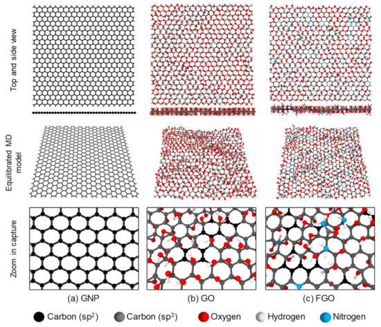 Representative MD models of GNP, GO, and FGO nanoplatelets (a–c).