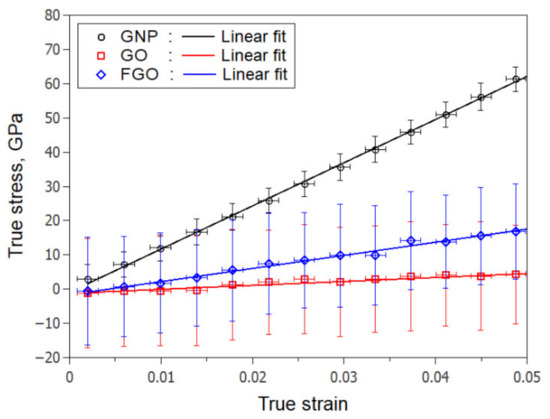 Representative uniaxial stress-strain response for GNP, GO, and FGO nanoplatelets.