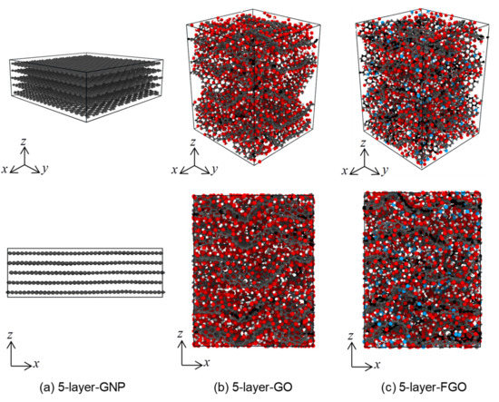 All nanoplatelets (GNP, GO, and FGO) were simulated with continuous lateral edges (periodic boundary conditions). The presence of carboxyl and carbonyl as functional groups in GO and FGO was ignored because they are more likely to exist in low concentrations at the edges and in defected regions (open rings or voids) in the graphene nanoplatelets [8,16]. Five MD replicates for each nanoplatelet type (GNP, GO, and FGO) were simulated to account for the possible variation in the predicted properties. Each MD replicate of the GO and FGO had a unique random distribution of the attached functional groups. However, the chemical concentration and content of functional groups were preserved for all GO and FGO MD replicates.