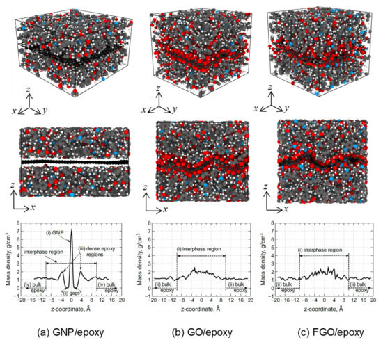 Figure 5 shows representative MD models of the GNP/, GO/, and FGO/epoxy nanocomposites with the mass density distribution along the z-axis. The COM point of each nanocomposite MD model was selected at the origin (0,0,0) of the x, y, and z coordinates. The average simulation box size of the GNP/epoxy MD models was (47.55 ± 0.03)x Å × (47.67 ± 0.04)y Å × (29.68 ± 0.30)z Å. Likewise, the average simulation box size of the GO/epoxy MD model was (42.38 ± 1.97)x Å × (43.41 ± 0.83)y Å × (38.42 ± 2.35)z Å, and the average size of the FGO/epoxy models was (43.39 ± 1.16)x Å × (42.42 ± 0.83)y Å × (38.51 ± 1.16)z Å. For all three nanocomposite types, the model size was sufficiently large enough to capture the entire interphase region, which was previously shown to be 10 Å wide [55]. It is noteworthy to mention that the size of the simulation box is governed by the lateral size of the nanoplatelets. The wrinkling effect in GO and FGO nanoplatelets resulted in a decrease in the lateral dimensions of their composite simulation boxes relative to the flat GNP/epoxy composite.