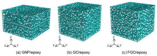 To predict the effective mechanical properties, the MD models were subjected to six deformation MD simulations. As performed previously [55], each of the five MD replicates of GNP/, GO/, and FGO/epoxy nanocomposites were subjected to tensile strain simulations along the x- and y-directions to predict the in-plane elastic modulus and in-plane Poisson’s ratio . Tensile strain simulations along the z-direction were used to predict the out-of-plane elastic modulus and out-of-plane Poisson’s ratio . To predict the shear moduli, shear strain simulations in the xy-, xz-, and yz-planes were performed on each MD sample. While the deformation simulations in xy-plane were used to predict the in-plane shear modulus , the deformation simulations in xz- and yz-planes were used to predict the out-of-plane shear modulus . Consequently, 30 MD deformation simulations were performed on the replicates of each nanocomposite for a total of 90 MD deformation simulations for the three nanocomposite types. For the axial tensile strain simulations, the NPT ensemble at 300 K with the Nose/Hoover barostat along the lateral directions was utilized to maintain the lateral surfaces at 1 atm pressure. These simulation settings were imposed to account for the Poisson contractions. The shear strain simulations were performed with the NVT ensemble at 300 K. All the deformation simulations were carried out over a total simulation time of 0.5 ns using 0.1 fs time steps and a strain rate of 1 × 108 s−1, which resulted in a maximum engineering strain of 5%.