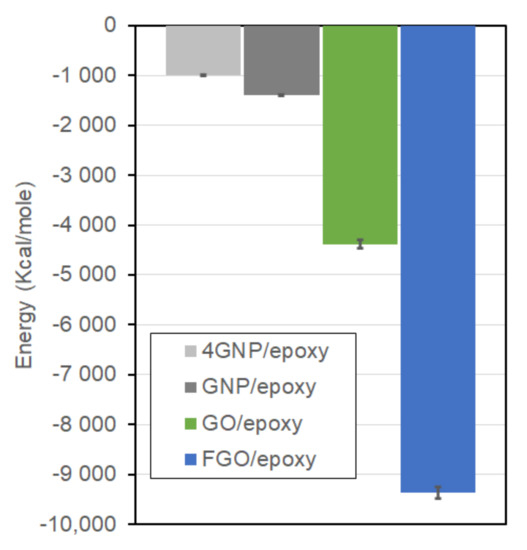 Figure 7 shows the levels evaluated for the current GNP/, GO/, and FGO/epoxy MD models in addition to the of a 4-GNP-layer/epoxy (4GNP/epoxy) nanocomposite, which was modeled in a previous work [55]. The 4GNP/epoxy MD sample was modeled to account for the effect of GNP agglomeration on the predicted mechanical properties of the nanocomposite. It is important to note that the for each nanocomposite type was averaged over the five MD replicates, which were well-equilibrated with ReaxFF. In addition, the larger the negative magnitude, the stronger the nanoplatelet/epoxy interaction. Clearly, the FGO/epoxy MD model with −9356 kcal/mole exhibits the highest among the other nanocomposites. The of the GO/epoxy MD model with −4381 kcal/mole is second highest. However, both the GNP/epoxy and 4GNP/epoxy systems exhibit a much lower of −1389 and −992 kcal/mole, respectively. Hence, the of the FGO/epoxy nanocomposite surpasses the GO/, GNP/, and 4GNP/epoxy nanocomposites by 113.6%, 573.6%, and 843.2%, respectively. The of GO/epoxy nanocomposite surpasses the GNP/epoxy and 4GNP/epoxy nanocomposites by 215.4% and 341.6%, respectively. The of GNP/epoxy nanocomposite exceeds the of 4GNP/epoxy nanocomposite by 40%, which can be attributed to the additional epoxy-epoxy interaction energy term across the single layer of GNP.