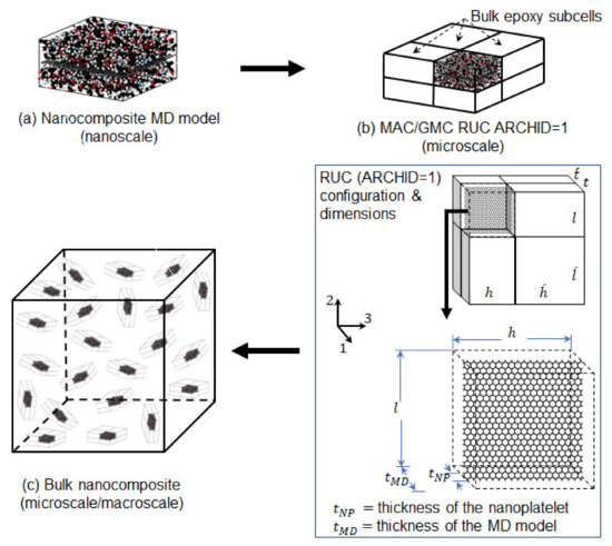 The Micromechanics Analysis Code based on the Generalized Method of Cells (MAC/GMC) [75,76,77] was used for the continuum-level microscale predictions. In the MAC/GMC code, the periodicity of the material microstructure is characterized by generating a repeating unit cell (RUC). The RUC involves a discrete number of subcells, where each subcell can be used to represent a single phase of the composite. There are several built-in architectures (ARCHID) of the RUC; however, the user can define custom architectures. Additionally, the user has the ability to control the fiber volume fraction and aspect ratio within the RUC. The continuum-level modeling steps for prediction of microscale mechanical properties, and the corresponding results, are detailed below. The multiscale modeling workflow is shown in Figure 8, which illustrates the continuum-level steps to design the nanocomposites. It is important to note that other options exist for micromechanics analysis. For example, the Mori-Tanaka approach is commonly used; however, the MAC/GMC approach allows for a more detailed description of the micro-level material topology.