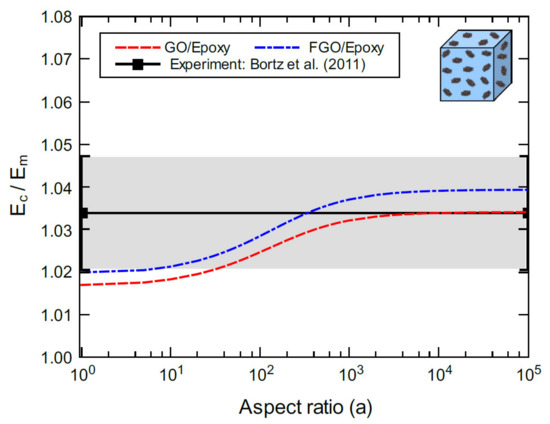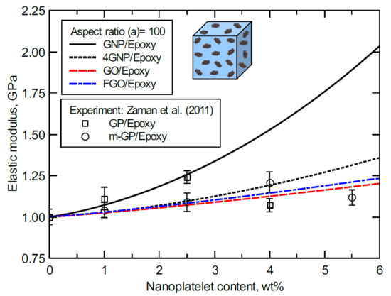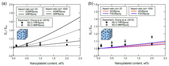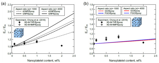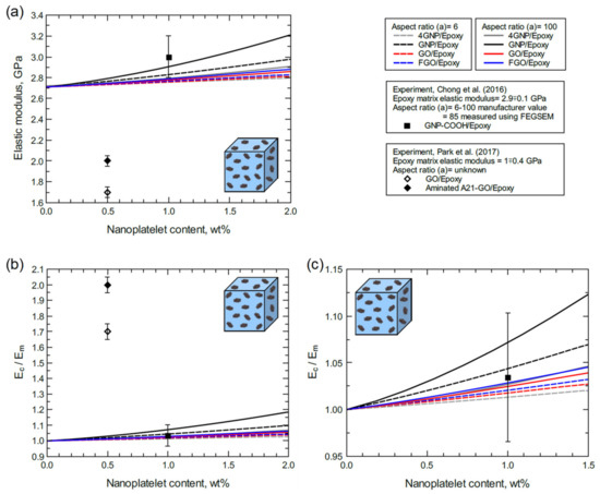 Figure 9 shows the predicted elastic modulus for each nanocomposite type for different nanoplatelet contents (wt%) at aspect ratios of 6 and 100. The unnormalized predicted moduli (Figure 9a) are significantly higher than the experimental values from Park et al. [34]. The epoxy matrix (DGEBA) modulus in their experiment was reported to be 1 ± 0.4 GPa. This matrix modulus is about two times lower than the typical value reported in the literature [42,78]. In addition, the nanoplatelet aspect ratio is unknown in the experiment. However, the experimental elastic modulus of GNP-COOH/epoxy (and GNP-O2/epoxy, which is unreported here as its mechanical properties are identical to the GNP-COOH/epoxy) from Chong et al. [42] indicates a good agreement with the predictions. The normalized composite modulus () by the matrix modulus () (Figure 9b,c) allows for more realistic validation of the current predictions with the experiment from Chong et al. The experimental aspect ratio of GNP-COOH nanoplatelets measured using field emission scanning electron microscopy (FESEM) was reported to be 85, while the manufacturer value is reported to be 6–100. In general, all the predicted moduli fall within the standard deviation of the experimental modulus from Chong et al. at 1.0 wt% content (Figure 9c). However, the experimental mean value is slightly lower than the predicted moduli for GNP/epoxy composite, which represents the ideal case using intact GNP structures with perfect dispersion in the matrix. The experimental mean value of the modulus is also close the predicted modulus values for 4GNP/, GO/, and FGO/epoxy composites with an aspect ratio of 100, and slightly higher than those with an aspect ratio of 6.