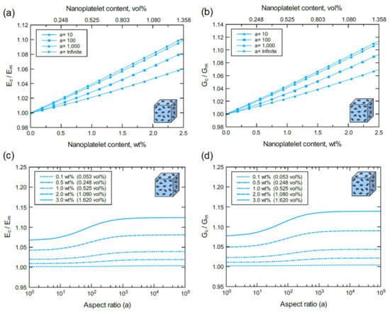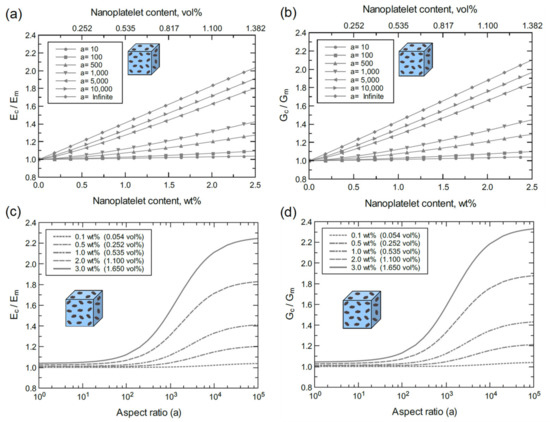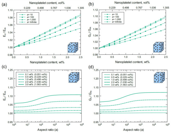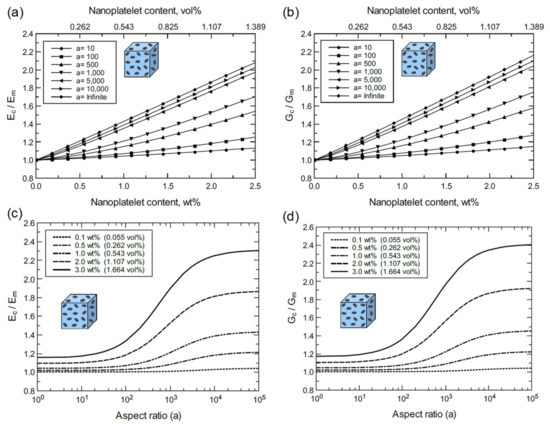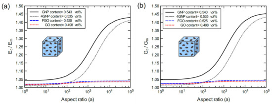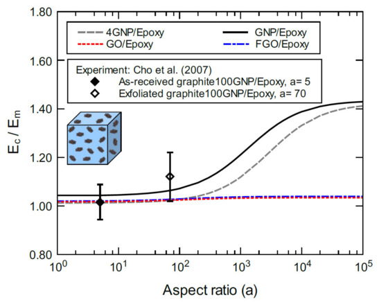 The aspect ratio of the filler used to reinforce the polymer matrix represents another essential factor that can greatly affect the properties of the composite. For polymer matrix reinforced with microscale fibers; such as carbon fibers (CF) and fiberglass, an infinite aspect ratio is commonly used for the fiber unless it is chopped. However, for the nanoscale fillers or particles, such as graphene nanoplatelets and carbon nanotubes, the situation is different as these nanofillers are produced with a wide range of aspect ratios [39,40,41,42]. The reported results from experiments that have been conducted to capture the influence for particular carbon nanofiller sizes (aspect ratio) mostly refer to an improvement in the engineering properties of nanocomposites as the aspect ratio increases [41,42,43,44]. Unfortunately, experimental techniques are infeasible and limited to investigating the role of aspect ratio in reinforcing polymer matrix with nanoscale fillers. Therefore, there is a need to fully understand the effect of changing the aspect ratio on polymer matrix properties.