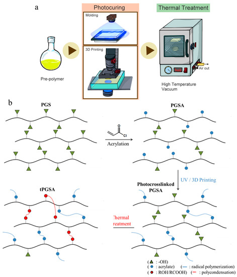 - Nijst, C.L.; Bruggeman, J.P.; Karp, J.M.; Ferreira, L.; Zumbuehl, A.; Bettinger, C.J.; Langer, R. Synthesis and characterization of photocurable elastomers from poly (glycerol-co-sebacate). Biomacromolecules 2007, 8, 3067–3073. [Google Scholar] [CrossRef] [PubMed]