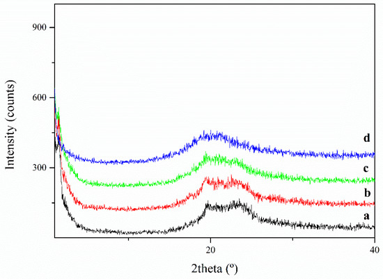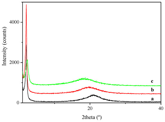 X-ray diffraction measurements were performed with a Siemens (Siemens AG, München, Germany) D5000 diffractometer (Bragg–Brentano parafocusing geometry and vertical θ-θ goniometer) fitted with a curved graphite diffracted-beam monochromator, incident and diffracted-beam Soller slits, a 0.06° receiving slit and scintillation counter as a detector. Samples were dissolved in a few drops of THF, placed directly onto a low background Si(510) sample holder for reflection analysis and then the solvent was evaporated before analysis. The X-ray diffractometer was operated at 40 kV and 30 mA to generate CuKα radiation. The angular 2θ diffraction range was between 1 and 40°. The data were collected with an angular step of 0.03° at 6 s per step.