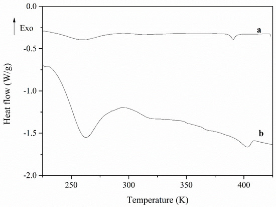 On the other hand, Figure 4 displays the calorimetric thermograms corresponding to the second heating scan of the PECH40 and PECH80 copolymers, performed at a 10 K/min heating rate. In both cases, it is possible to distinguish at least two prominent endotherms, the first one around 262 K and the other at 402 K. Between both, a small shoulder can be observed around 310 K. The combination of XRD and calorimetric analyses leads to the following conclusions: The former endotherm can be related to the melting of a small crystalline portion formed, while the latter relates to the clearing transition, both associated with the presence of the lateral mesogenic chains. The second shoulder could be assigned to the glass transition or/and the melting of another crystalline phase [26].