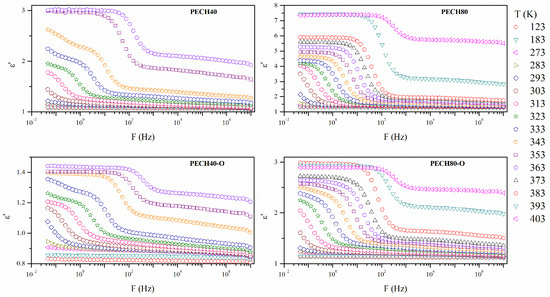 Figure 5 and Figure 6 display the isothermal curves of the real ε’ and imaginary ε″ parts of the complex dielectric permittivity ε* for all the unoriented and oriented samples. All the analyzed isothermal curves display a similar pattern, one plateau, followed by a decreasing step, which is especially evident for the PECH80 copolymer.