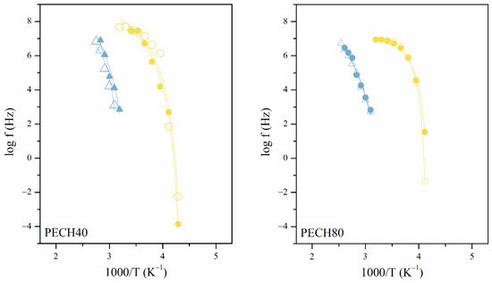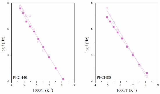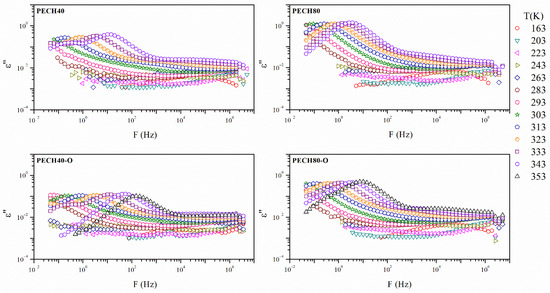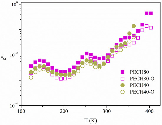 The dielectric behavior of unoriented (PECH 40, PECH 80) and oriented (PECH 40-O, PECH 80-O) copolymers showed dielectric relaxations for the whole range of temperatures and frequencies, which are related to macromolecular motions in a wider temperature range. The dielectric relaxation spectra of these copolymers were analyzed in terms of the real (ε′) and imaginary (ε″) parts of the complex dielectric permittivity (ε*), and tan δ in the temperature range between 110 K and 400 K, in the frequency interval of 10−2 to 107 Hz. The dielectric relaxations plotted in terms of the loss factor, ε″, were initially deconvoluted following the Charlesworth method. To account for the additive character of the dielectric response, the data were fitted by adding up as many Havriliak–Negami (HN) functions as relaxation processes necessary to adjust all the values for each temperature. The HN function for ε″ is shown in Equation (1) [27,28,29,30].