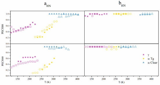 In agreement with the above results, the complex relaxation spectrum of unoriented and oriented PECH40 and PECH80 copolymers were analyzed with the following two relevant relaxations: αTg relaxation, related to the glass transition, and the other one being αClear relaxation, related to the clearing transition. However, the DSC observation shown in Table 1 suggests the existence of a third process at lower temperatures than the glass transition and overlapped to it, which can be related to precursor molecular motions of the melting of a certain crystalline portion induced by the presence of the lateral side chains.