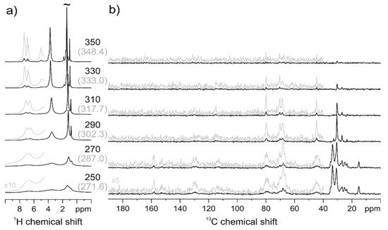 PECH80 1H MAS (a) and 13C CP-MAS (b) NMR spectra at variable temperature. In brackets, the temperature values corrected for frictional heating under fast MAS conditions are reported.