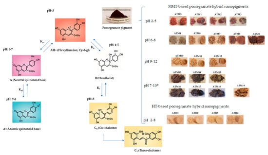 Currently, one of the most promising strategies for stabilizing the colour of ACNs and flavylium cations is their encapsulation by intercalating and/or adsorbing them on solid surfaces and/or in confined spaces []. In particular, the colour stability of ACNs is very limited under alkaline conditions which limits their practical use []. The visual aspect of the colours obtained for the different synthetized hybrid nanopigments is included in Figure 1. As it can be seen, in the case of MMT-based PDNPs a wide palette of colours ranging from red to blue hues were obtained. This behaviour could be related to the different pH values used in the synthesis conditions (Table 1) and previous discussion in Section 3.1 related to the main ACNs present in the pomegranate pigment and their stability with pH values. In addition, the colour of the clay minerals, in particular MMT, could also affect the colour of the resulting hybrid nanopigments [].