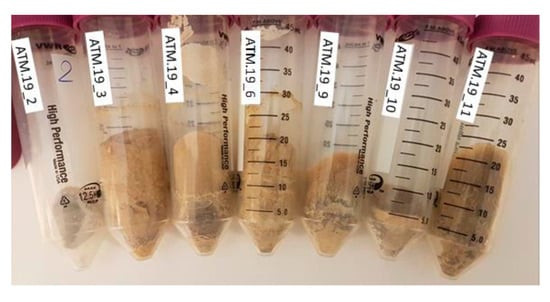 Finally, concerning the biomordant-based hybrid nanopigment ATM19, the final colour of this sample was significantly different from the equivalent one containing the commercial mordant (ATM14). This behaviour was essentially attributed to the intrinsic orange-brownish colour of the biomordant additive compared to the whitish colour of the commercial mordant. The own colour properties of pomegranate peel biomordant to act itself as a source of colour for dyeing and the possible synergistic effects on shades when being used in conjunction, at different concentration levels, with other dyes were reported by Singhee D. []. Different additional experiments were carried out with the aim of studying the effect of decreasing the biomordant concentration and using different concentrations of CPB and silane modifiers (ranging from 1–5 wt%). However, all the obtained samples showed a similar brownish colour regardless of their additives’ composition (Figure 2 and Table 3).