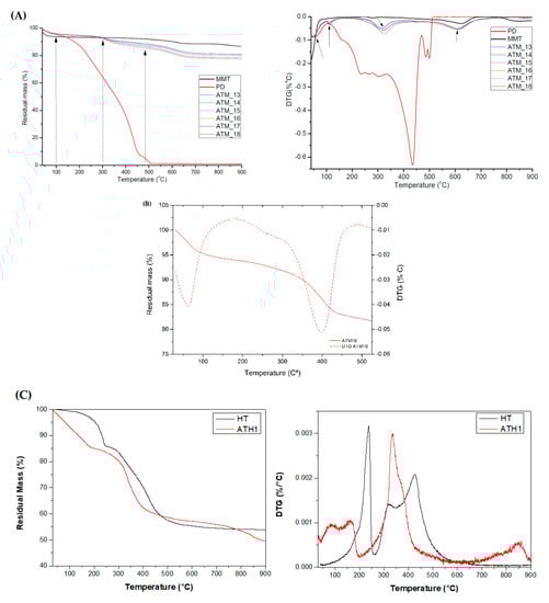 TG and DTG results obtained for (A) MMT, PD, and ATM13-ATM18 PDNPs; (B) zoomed area for ATM19; (C) HT, PD, and ATH1.