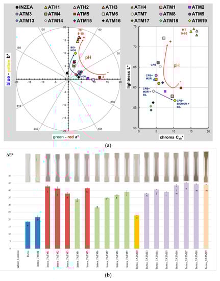 (a) CIE-a*b* diagram of the chromatic variation of INZEA-based bionanocomposites containing the most significative ATM and ATH nanofillers with pH. (b) Total colour difference of INZEA-based bionanocomposites obtained with MMT-based PDNPs.