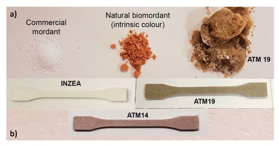 (a) Commercial mordant, natural biomordant extracted from pomegranate peel and MMT hybrid nanopigment using PD and the biomordant (ATM19); (b) INZEA-based bionanocomposites containing 7 wt% MMT-hybrid nanopigments ATM19 and ATM14.