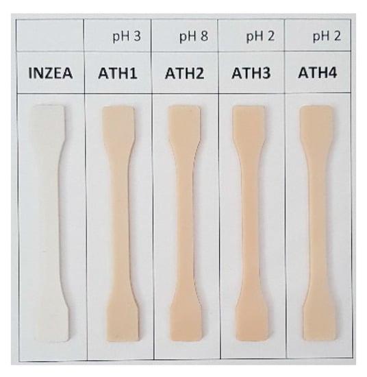The mechanical characteristics of the bionanocomposites filled with HT-based nanopigments were influenced by the buffer behaviour of the nanofiller which limited colour variations, bringing all nanofiller formulations to alkaline pH values after the synthesis process (Table 2), and also altering the interaction between the biopolymer matrix and the nanoclay. These reactions had an effect on the ion exchange capacity of hydrotalcite and consequently on the matrix/charge compatibility []. According to E values, INZEA_HT1 sample showed the most positive effect on the matrix/modified nanofiller compatibility (Figure 10c). Although all ATH nanofillers produced a general increase in the elastic modulus, which was more relevant (34%) for ATH1 (1973 MPa) and to a slightly lesser extent (25%) for ATH2 (1830 MPa) compared to the biopolymer matrix, a limited effect on deformation at break was observed resulting in values which were maintained around 5% for all HT-based polymer samples. Due to the reduced deformability, although the σ-ε curves of the bionanocomposites had a faster rise, the samples achieved lower strength values compared to the matrix. Bionanocomposites with the same deformation and higher Young modulus also showed higher tensile stresses (INZEA_HT1 showed, in this case, the best performance with 37 MPa followed by INZEA_HT2 with 36 MPa, and slightly lower values for INZEA_HT3 and INZEA_HT4).