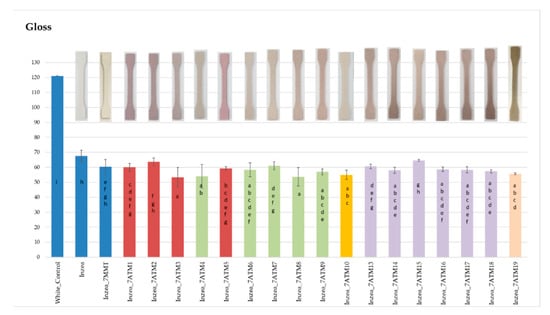 Gloss values obtained for INZEA-based bionanocomposites containing 7 wt% of the most significant ATM nanofillers (Different superscripts in the same column for each formulation indicate statistically significant different values (p < 0.05)).