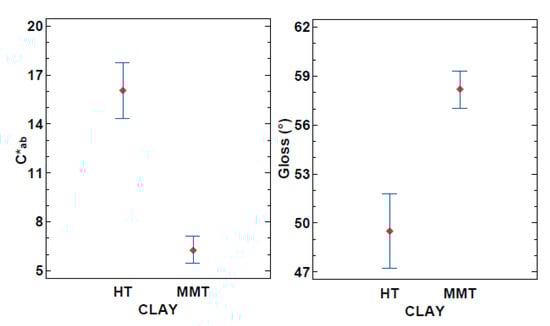 Finally, statistically significant differences between the nanoclay structure used for PDNPs synthesis and the final optical properties of the bionanocomposites in terms of Cab* and gloss values were obtained (p < 0.05). In this sense, HT-based samples showed higher chromatic and lower gloss values compared to MMT-based hybrid pigments (Figure 8).
