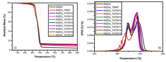 The observed behaviour for PDNPs greatly influenced the thermal properties of INZEA-based systems. The curves related to mass loss and derivative weight loss for some of the bionanocomposites added with 7 wt% of the MMT-based nanopigments are shown in Figure 9a,b. As it has been reported [], a double degradation peak can be found for the INZEA neat matrix, with two main steps centred at 350 and 400 °C, which could match with the possible degradation temperatures of PLA and poly(butylene succinate) (PBS) polyesters, respectively. In addition, unmodified INZEA matrix maintained a residual mass of ca. 5 wt% at 900 °C, which was increased when the nanofillers were introduced. This behaviour is in accordance with the possible presence of an inorganic filler in the formulation of the commercial product, as it has been reported in other work [].