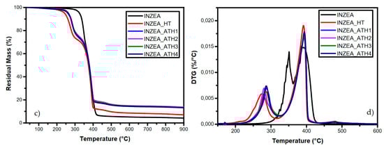 A deep analysis of the DTG curves for the bionanocomposites containing neat MMT or HT and PDNPs (Figure 9) clearly indicated that, while no substantial variations were noted in the case of MMT-based systems, the thermal stability of the overall blend was strongly affected with the addition of HT and ATH nanofillers. Specifically, while the maximum degradation rate remained substantially unaffected at higher temperatures, the weight loss rate of the less stable components was shifted from 350 °C for neat INZEA to 287 and 276 °C, respectively, for INZEA_HT and INZEA_HT1-INZEA_HT4 samples (Figure 9c,d). The obtained degradation path for bionanocomposites, differing from that of the neat matrix, can be rationalized by considering the organic nature of the nanopigments which were indeed responsible of the decrease in thermal stability of the polyester matrix. In this sense, both unmodified nanoclays could catalyse hydrolysis reactions, contributing MMT platelets with–OH moieties present on the surface whereas the presence of moisture in the interlayer spacing of hydrotalcites could affect the thermodegradative pattern of the corresponding bionanocomposites.