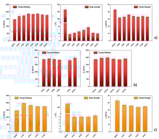 The tensile results obtained for bionanocomposites containing 7 wt% of MMT-based nanopigments synthetized at different pH values are shown in Figure 10a. The Young modulus (E) values of all polymer samples were higher than that obtained for the neat matrix, showing an increasing trend for E values moving from acid pH values to neutral ones. After that, the elastic modulus decreased again moving from neutral towards alkaline pH values. In particular, INZEA containing ATM6 showed an elastic modulus value of 1874 ± 65 MPa, with an increase of 28% compared to neat INZEA and 41% compared to the bionanocomposite with the unmodified MMT []. A similar trend was also found for the strain at break: moving from the lower pH to neutral, the elongation at break increased progressively and decreased again for pH values higher than neutral. However, the tensile stress values did not show any significant changes. The synthesis treatment of the nanofillers at different pH values also affected the tensile properties of the bionanocomposites. In general, the nanofillers synthesis process was proved to be effective for improving the mechanical properties of the polymer samples, overpassing the reference values of the bionanocomposite with unmodified MMT (elastic modulus = 1331 ± 28 MPa, tensile strength = 34 ± 1 MPa, elongation at break = 7% ± 1%) []. In particular, it should be noted that samples with nanofillers synthetized at slightly acid or neutral pH values showed the best mechanical properties. This result can be explained by considering that a slightly acid environment could favour the compatibility between the polymer matrix and the PDNP filler [] compared to an alkaline one, but excessively acid pH values could induce a corrosion phenomenon that could damage the bionanocomposites, worsening their mechanical properties [].