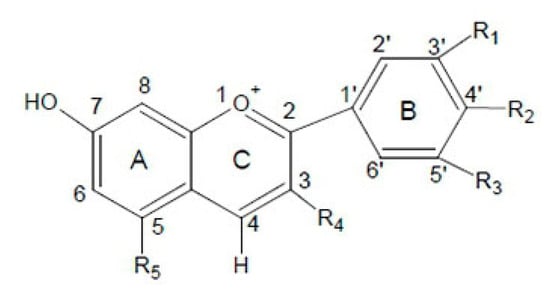 ACNs are generally identified by their flavylium cationic forms (Table 2) which are related to the final colour observed for ACNs in aqueous solution, due to a series of reactions that take place with thermodynamic and kinetic implications, mainly based on different pH values and equilibrium constants [,]. ACNs act as weak diacids and they become deprotonated with increasing pH values, increasing maximum absorption towards higher wavelengths. The pH-dependent dynamic equilibrium of the different ACN structural forms present in aqueous solutions was reported by Fedenko et al. [] and Houghton et al. []. The red flavylium cation (AH+) is favoured at very acid pH values (pH < 2–3), whereas at higher pH values some reversible (to some extent) chemical transformations could occur. At pH values higher than pKa1, the deprotonation of AH+ gives the neutral quinoidal base (A) which is characterized by purple tonalities. At pH values above pKa2, A is further deprotonated obtaining the blue anionic quinoidal base form (A−). These two subsequent deprotonations result in a shift in maximum wavelength of 20–30 nm and 50–60 nm for A and A−, respectively. Due to the instability of A and A− forms, the transformation of AH+ to A is normally less thermodynamically favourable than the hydration of AH+ forming the colourless hemiketal form B. This reaction breaks the ring’s aromaticity and produces the loss of adsorption properties, transforming the initial structure into an uncoloured carbinol-pseudo base. Finally, the B form transforms tautomerically by ring opening into yellow cis-chalcone Cc and isomerizes to trans-chalcone CT.