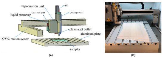 Atmospheric air was used to generate the plasma. The substrates were fixed on an aluminium plate, and the plasma jet was controlled by an X/Y/Z movement system. The plasma voltage was adjusted to 300 V, the current was adjusted to 0.3 A, and the power was adjusted to 480 W. The distance between the sample and the nozzle was kept constant at 12.5 mm. The jet travel speed and the number of passages for each sample are described in Table 1. All experiments were carried out under controlled conditions.