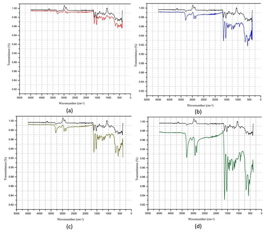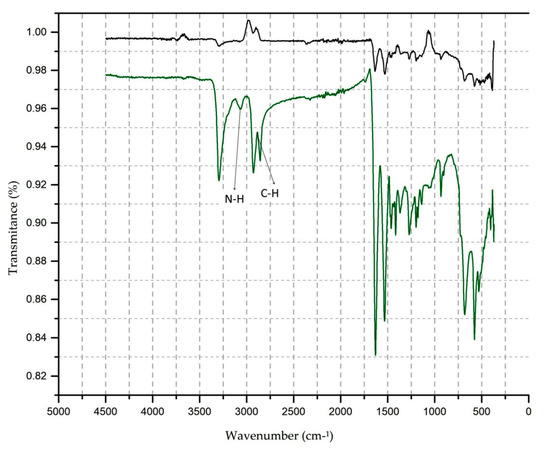 In the FTIR tests, there is an increase in the transmittance value of aromatic, carboxylic groups (C=O, 580 cm−1), amides (N=H, 1630 cm−1), and methyl groups (CH 1369 to 1463 cm−1), for the NH groups and symmetrical and asymmetric CH stretching in the bands of 3290, 3068, and 2860 cm−1.