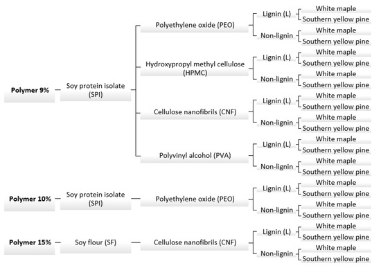 The experimental design can be seen in Figure 1; the formulations were composed of protein and different coadjutant polymers, namely polyethylene oxide (PEO), hydroxypropyl methylcellulose (HPMC), cellulose nanofibrils (CNF) or polyvinyl alcohol (PVA), each for a given formulation. The total concentration of solids in the formulations was kept at 9%, 10% and 15%, intended to evaluate the effect of solids content on rheology and adhesive properties of the formulation. The weight ratio of each of the solid components was kept as follows: 1 part of coadjutant polymer, 7 parts of protein and 2 parts of lignin (when required); when lignin was not added, the coadjutant polymer was kept the same and the balance was the protein content. The formulations were prepared with or without kraft lignin as described above. When the formulations achieved homogenous dispersion, the samples were stored for further use on the rheology and adhesive tests.