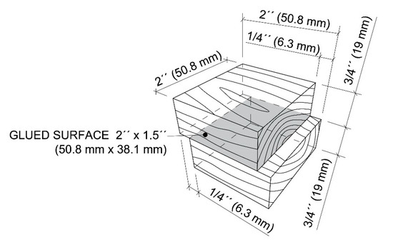 The standard testing method ASTM D905-08 was used to determine the shear strength between pairs of bonded wood blocks. A hardwood species (white maple) and a softwood species (southern yellow pine) were chosen. Wood specimens were selected with straight grain and without any significant defects such as knots, decay and discoloration. Firstly, the surfaces were smoothed using a planer S-290 (Baxter D. Whitney & Son, Greensboro, NC, USA) to the thickness of ¾ inches (19 mm). Afterwards, a straight-line rip saw SL-52 (Diehl Woodworking Machine, Wabash, IN, USA) and miter saw DWS780 (Dewalt Industrial Tool, Baltimore, MD, USA) were used to give 2 by 2 inches (50.8 mm by 50.8 mm) dimensions to the wood blocks. Figure 2 shows the standard form and dimensions of the test specimen. A total of 10 testing specimens were required for each type of adhesives. The adhesives were applied at a weight of 0.4 g, one-sided using a plastic pipette and spread on the bonded surface. The amount was checked by a balance APX-6001 (Denver Instrument, Bohemia, NY, USA). Once the adhesives were applied (within 4 min), blocks were assembled and taken to pressing immediately. The laboratory press Carver 3946 (1DI0A00, 12-ton capacity; Carver, Wabash, IN, USA) was preheated to a temperature of 340 °F (171 °C) and test specimens were pressed using 350 psi (2.4 MPa). After 10 min of pressing time, the specimens were conditioned for 24 h and prepared for mechanical testing. The environmental conditions were the same as at the chemical laboratory.