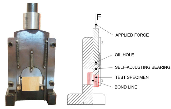 The shear strength of the adhesive bonds was measured by a mechanical testing machine Alliance RF/300 (MTS Systems Corporation, Eden Prairie, MN, USA). The shearing tool (Figure 3) was fitted to a testing machine and compression load was applied to test specimens. The grain direction was parallel to the direction of loading during test. The speed of the moveable crosshead was set up to 0.2 in/min (5 mm/min) constant speed. The software Testworks 4 (Testworks, USA) was used to analyze the strength at break points σ (psi) according to Equation (3). Testworks calculated breakpoints σ (pounds per square inch, psi) as a proportion of the measured peak loads F (lbf) and the bonded surface area A (in2) that were measured by a caliper 500-196-20 (Mitutoyo Corporation, Kawasaki, Kanagawa, Japan) with the precision for each sample.