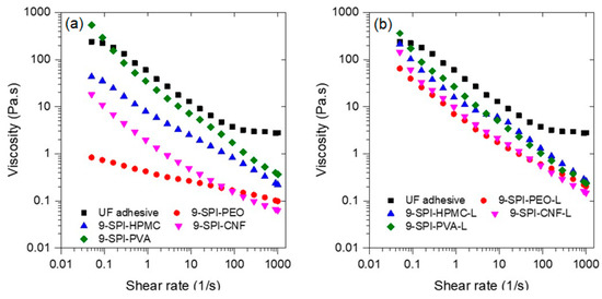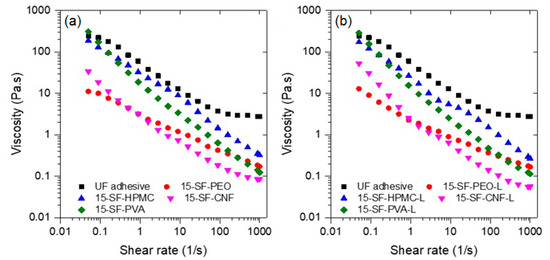 The rheology of wood adhesives is an important variable to consider during application; a formulation with low viscosity will be less likely to remain on the surface of the substrate during application, whereas one with high viscosity will be difficult to spread on the surface. The rheology of the formulations with and without lignin compared to the UF commercial adhesive are shown in Figure 4. The results indicate that all the formulations exhibit shear thinning behavior; it can also be seen that the viscosity of adhesive formulations depends on the coadjutant polymer used and follows the trend SPI-PVA > SPI-HPMC > SPI-CNF > SPI > PEO. The only formulation with viscosity like the UF adhesive is the one containing PVA; this might be due to the formation of hydrogen bonds between PVA and protein molecules [76]. Furthermore, the addition of lignin increases the viscosity of all formulations to values very close to the UF adhesive. Interestingly, the formulation with PVA did not increase viscosity upon lignin addition.