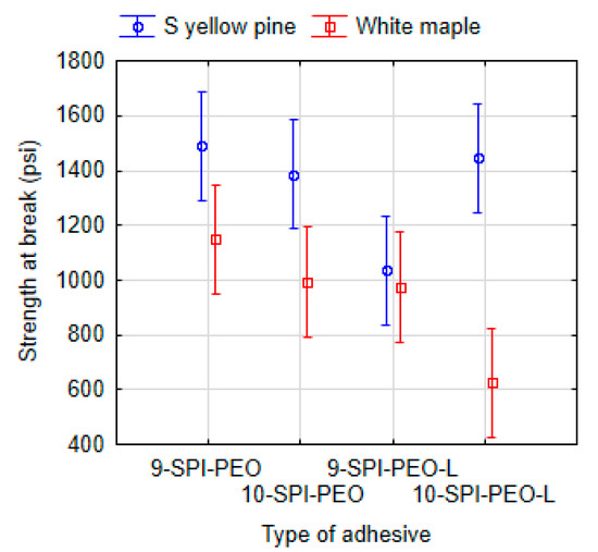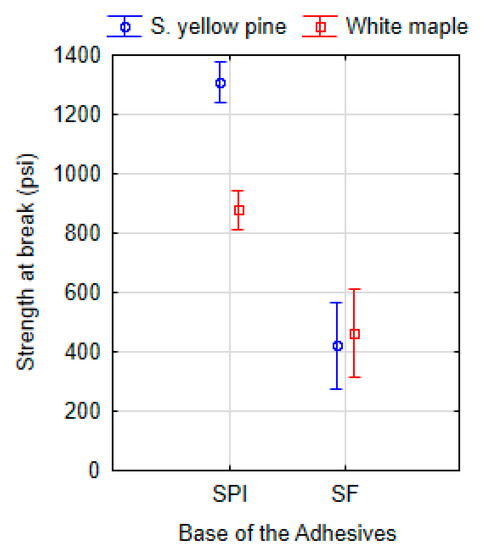 Analyzed data of strength at break of southern yellow pine according to the type of tested adhesive.