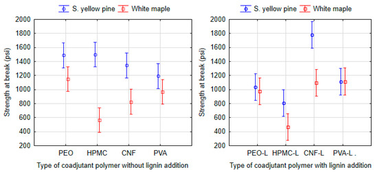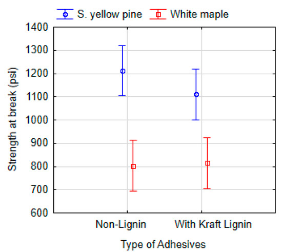 The lignin effect was evaluated by comparing the strengths at the break point of adhesives with added kraft lignin and non-lignin adhesives. The data were analyzed using ANOVA (Tukey HSD) at a 95% significance level (Figure 9). In summary, the adhesives applied to southern yellow pine (P = 0.558) and white maple (P = 0.999) did not prove a statistically significant effect of lignin on strength at break point.