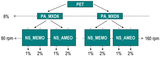 The next step is to produce sepiolite nanocomposites, introducing the masters done previously into an extruder, using PET as matrix. The materials were dried prior to introducing them into the extruder. The PA_nS master drying conditions were 24 h at 80 °C, and 8 h at 120 °C for the PET. The reason for using two different drying conditions is due to the nucleating effect of sepiolite in the PA and PET matrixes, which alters their crystallization behavior [15,20]. The final composition of the materials is 91% PET, 8% PA, and 1% nS, or 90% PET, 8% PA, and 2% nS. In the figure below (Figure 1), it shows scheme with the materials produced. The percentages of sepiolite are theoretical because the extruder used did not have a special powder dosing system, so it will be seen in the results the exact amount of sepiolite in each sample. Besides these samples, a control one was produced without nanosepiolite, just using PET with 8% of PA_MXD6 (PET/8PA_MXD6).